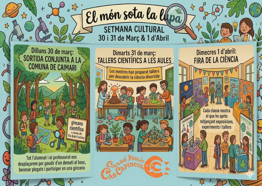 En el marc del projecte de centre d’aquest curs, “EL MÓN SOTA LA LUPA. Mira, pregunta, descobreix.”, feim difusió d’un conjunt d’activitats relacionades amb la ciència i la tecnologia que poden ser d’interès per a les famílies i l’alumnat.