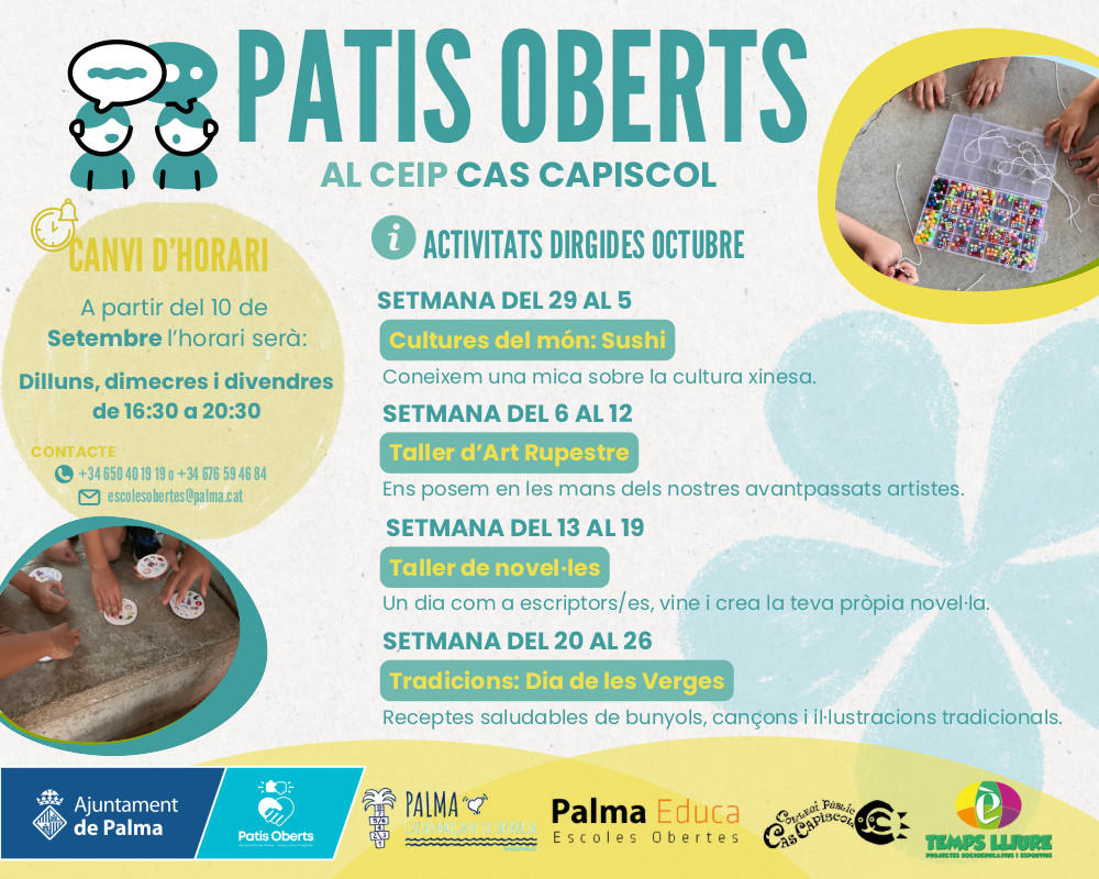 Programació d’octubre a Patis Oberts Ana Eva Alvarez Rodriguez29/09/25 Aquí podeu consultar les activitats que es duran a terme a Patis Oberts durant el mes d’octubre.
